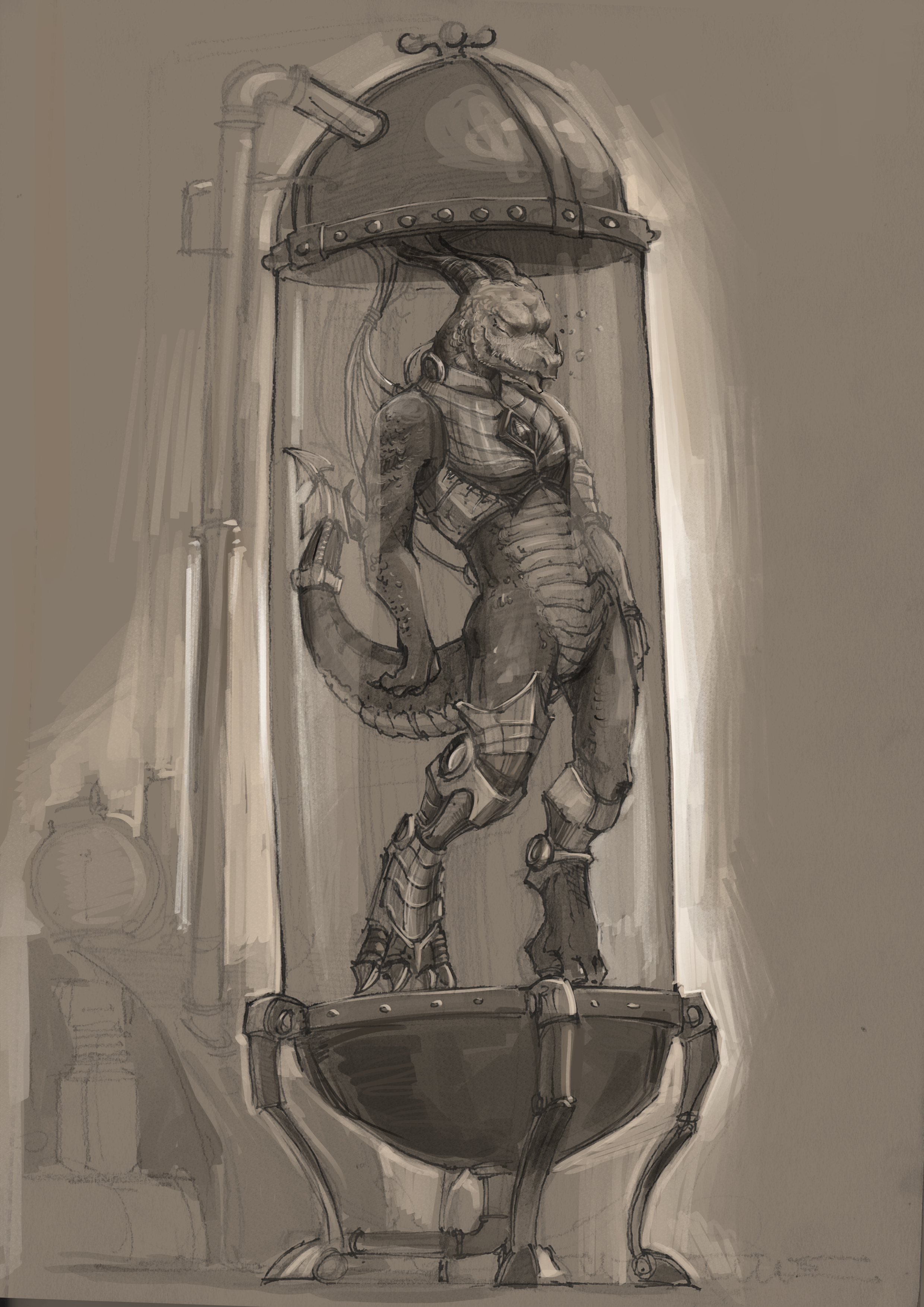 Morgrim found him in a scrapyard and try to heal him as he was wounded, she find him extremely attractive, not only as a male but because of all his "augmentation".